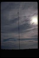 The 80 meter antennas were mainly made of wire and wire is very hard to photograph. The biggest of the 80 meter antennas was a 3 element delat loop on a 100 foot boom. It was suspended between two 170 foot towers. The tops of the loops were at about 160 feet and the bottoms were around 90 feet. It was pointed at Europe and was always at least 10db better than a diople at the same height. It was also a very quiet antenna. You can just barely make out some of the loops in this photograph.